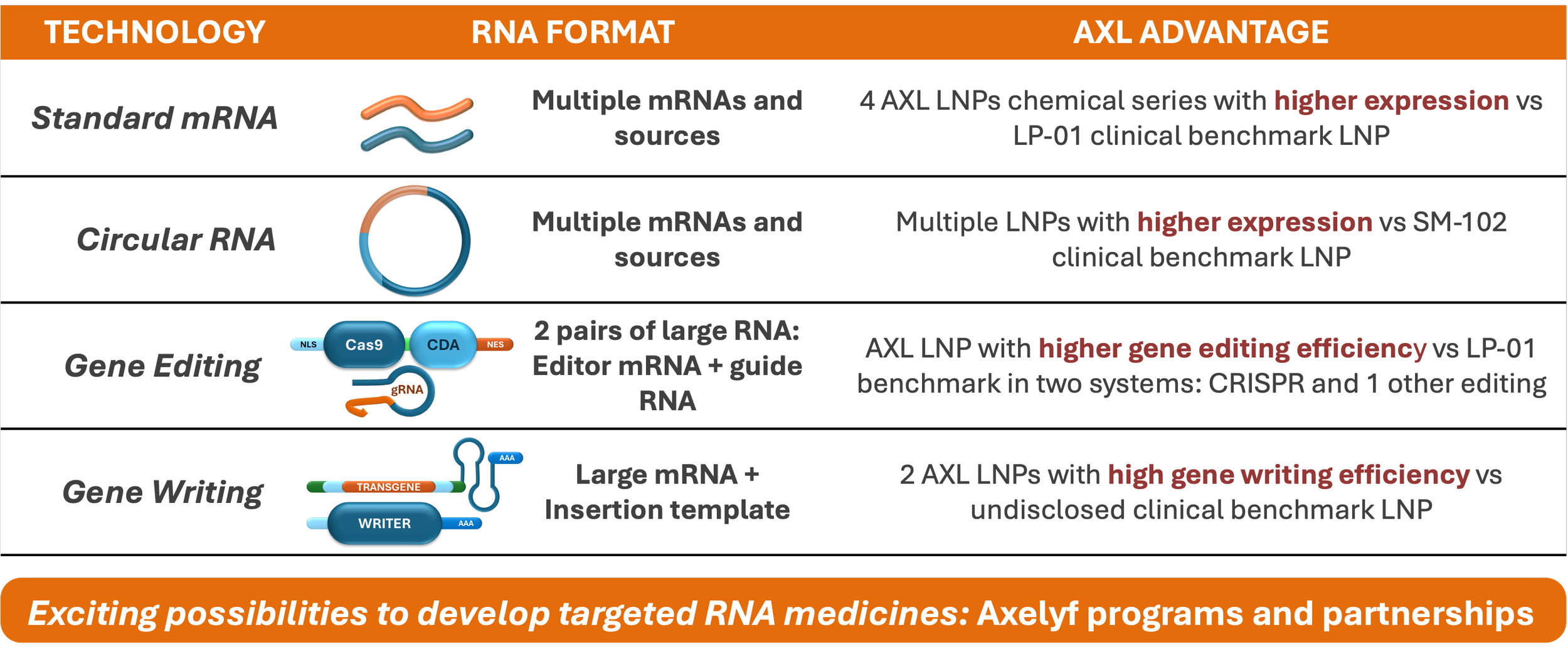 Axelyf is equipped to integrate several RNA formats with AXL delivery technology to yield more potent and effective autoimmune and oncology therapeutics.