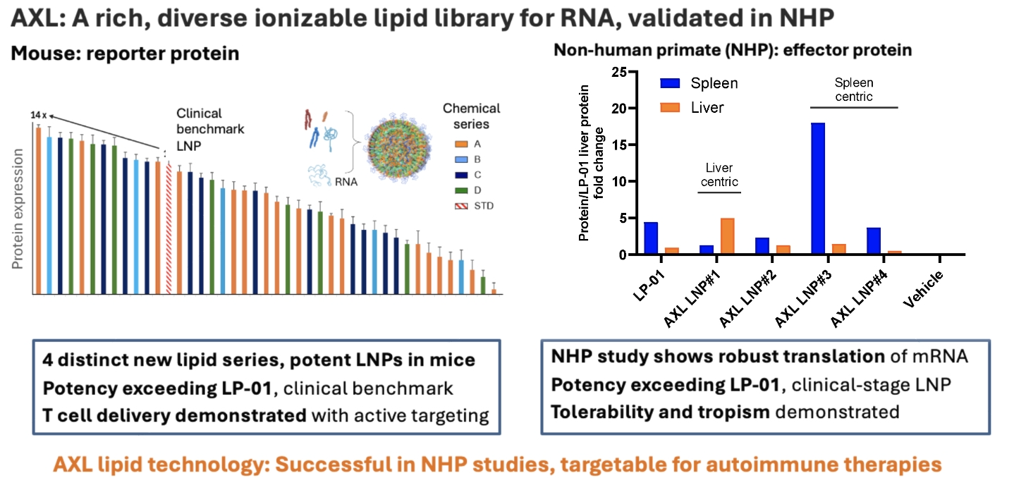 In August 2024, Axelyf completed acquisition of an integrated lipid library from 76bio. This molecular library of potent delivery compounds for mRNA drugs enables us to pursue best-in-class LNPs for our own product candidates and partner our technology for products of other companies in the future.